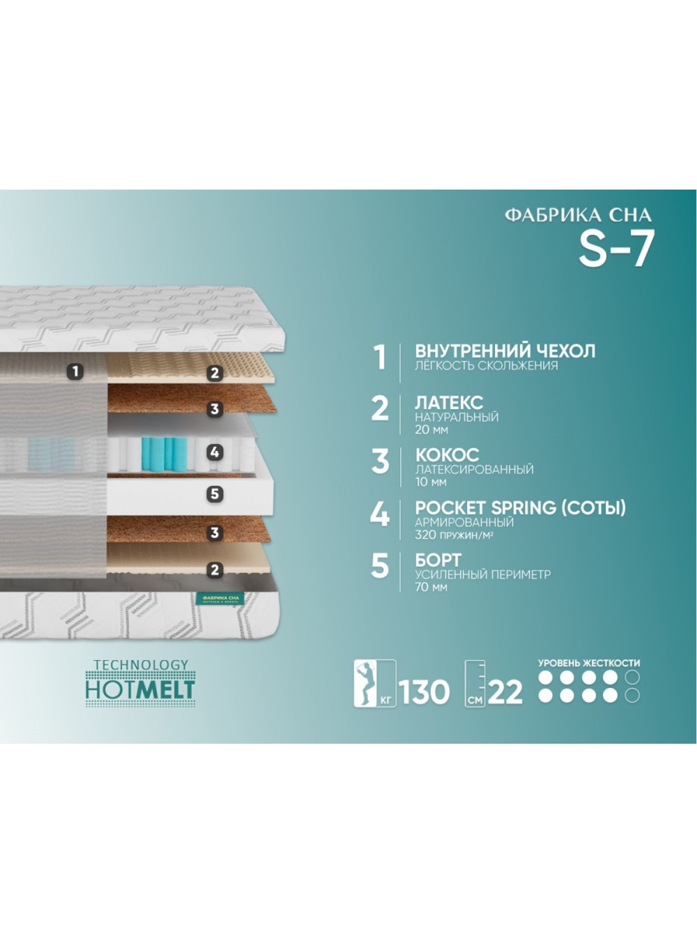 7. Евро периметр Система жесткого периметра матраса выполнена из пены высокой плотности. Располагается внутри матраса, создает идеальную форму его боковой части и дополнительно повышает жесткость краев, защищая их от проседания при нагрузках.