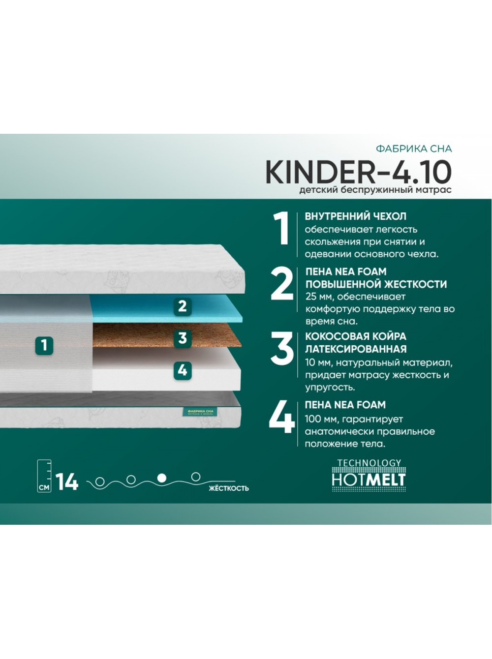 Состав матраса Киндер-4.10 идет из кокосовой койры и пены Air Foam. Модель матраса идет с двух сторон разно разной жесткости: средний/ среднежесткий.